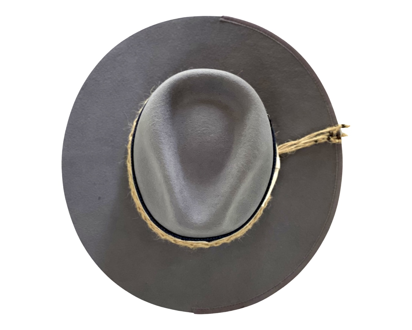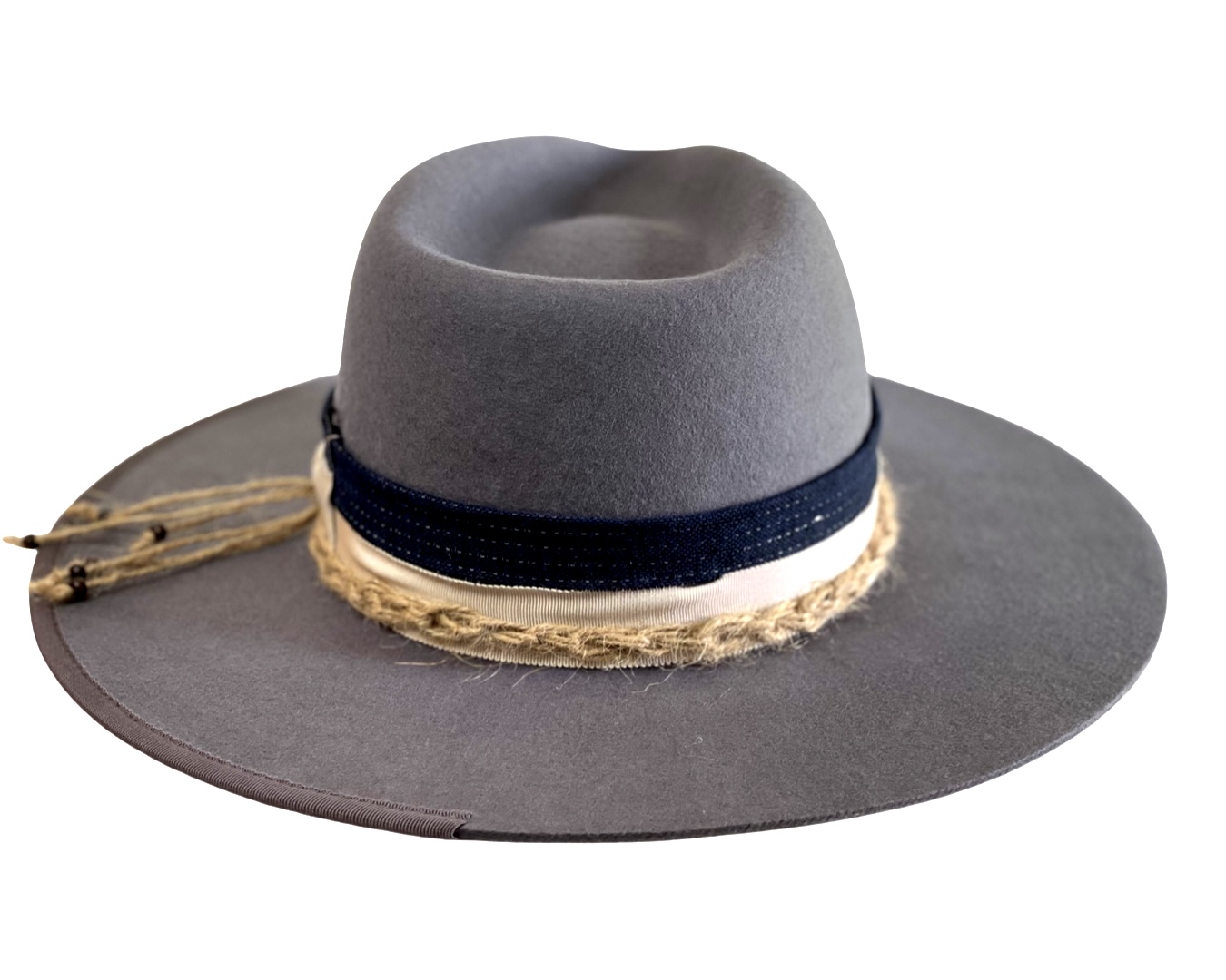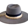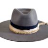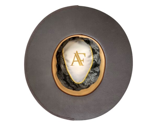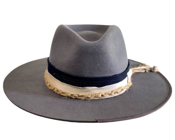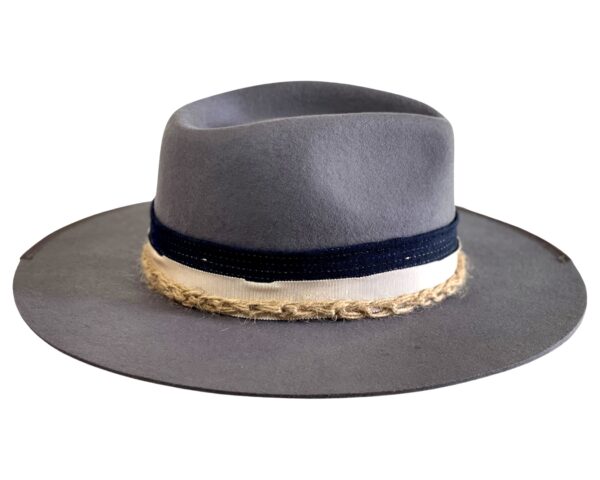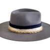 A smoke grey Merino Wool Fedora hat men sporting a navy stitched band and finished with a cream strip and unique rope detailing. This design is perfect for those who want the tradition of the fedora with a unique contemporary spin. Boating the historic silk-lined AF logo on the interior, this fedora encourages self-expression through timeless style and ultimate comfort.